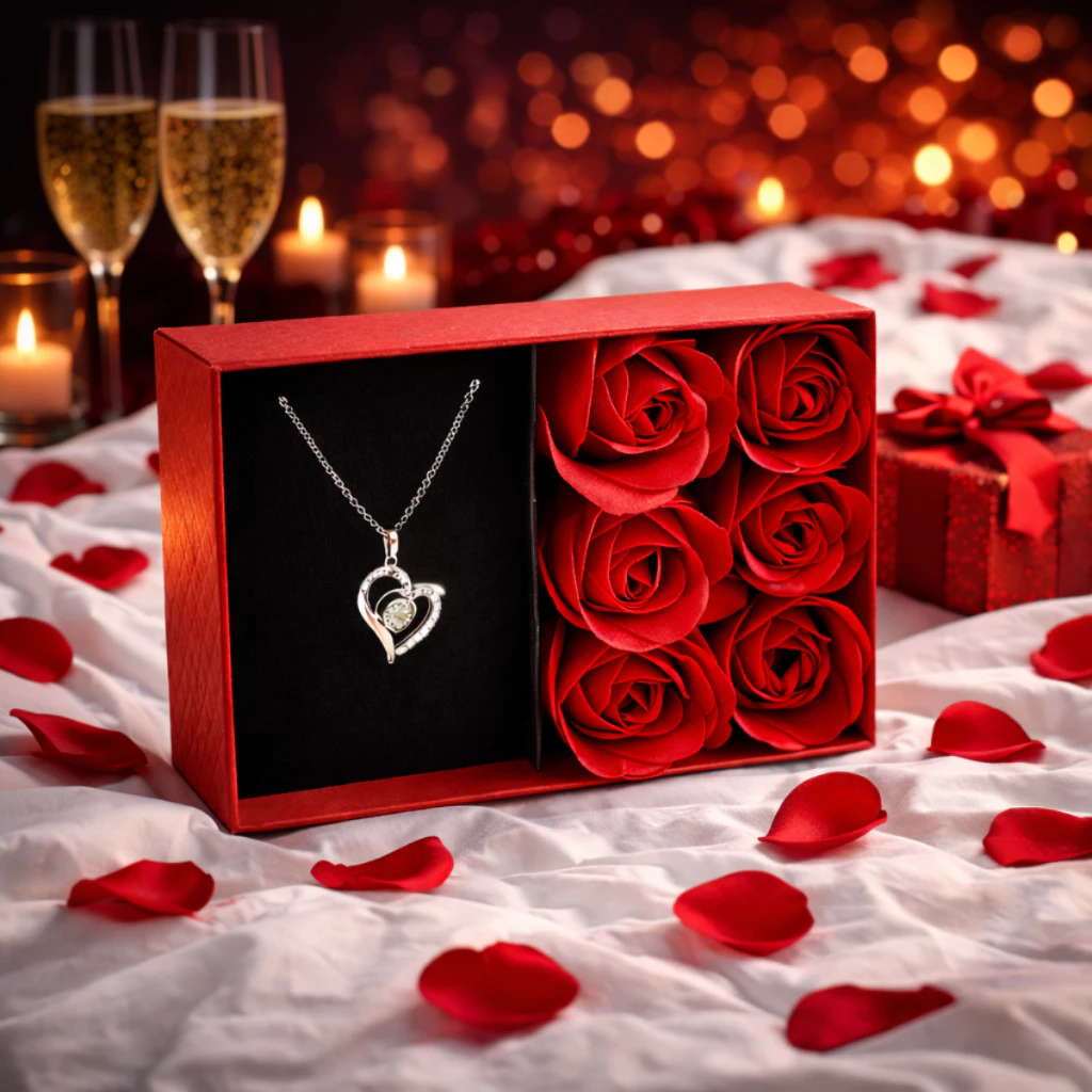 Caixa Presente Luxo com Colar e 6 Rosas – Edição Romântica