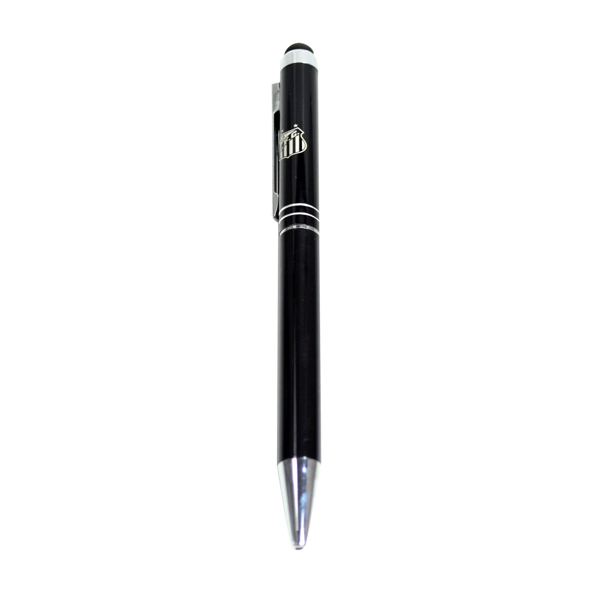 Estilosa caneta de metal roller ball do Santos. Além de escrever suavemente, a parte superior da caneta serve para escrever em tela de tablet e smartphone. Material: metal