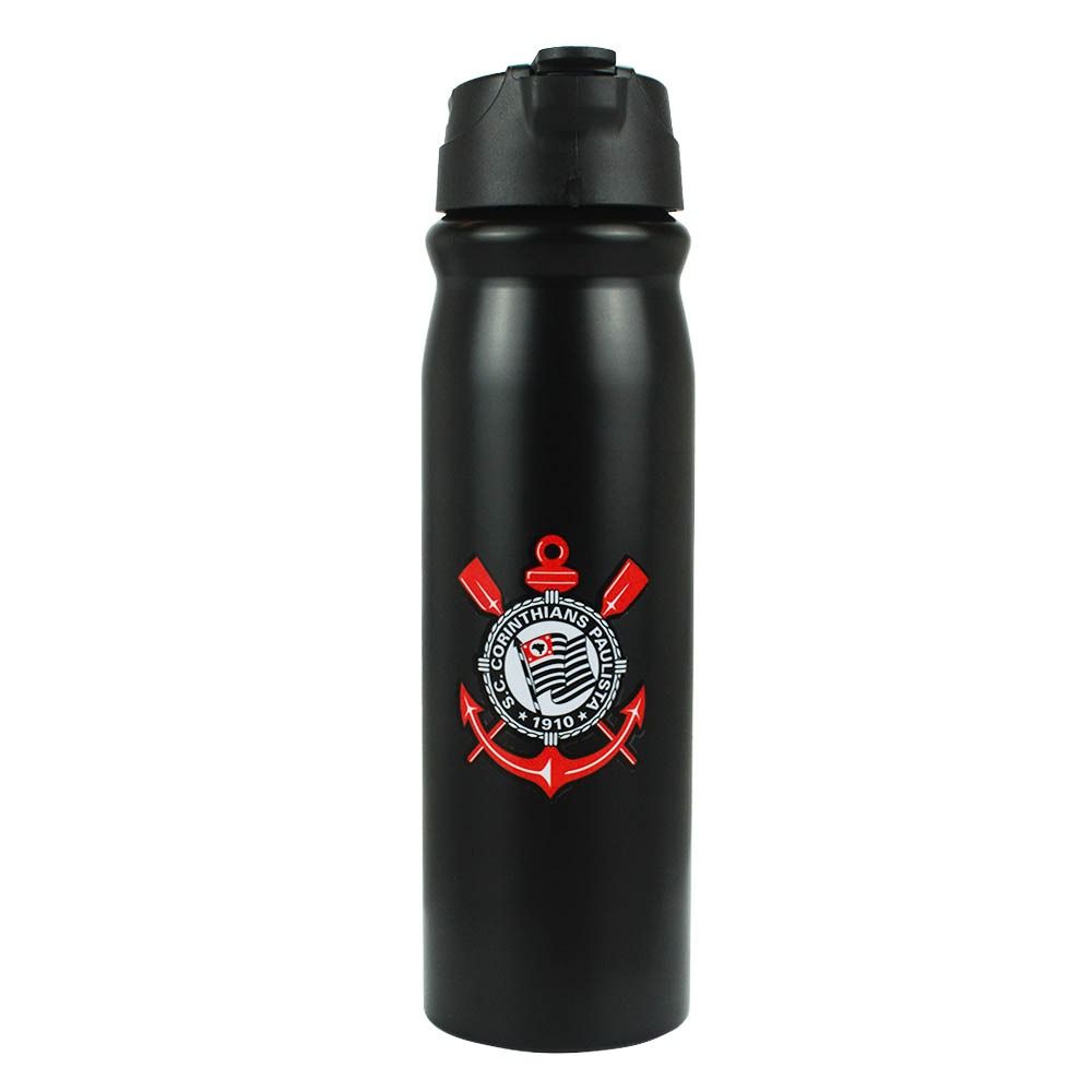 Garrafa de alumínio com capacidade para 650 ml estampada com escudo do Corinthians. Vem com canudo retrátil e uma pequena alça para carregar na mão. Material: alumínio