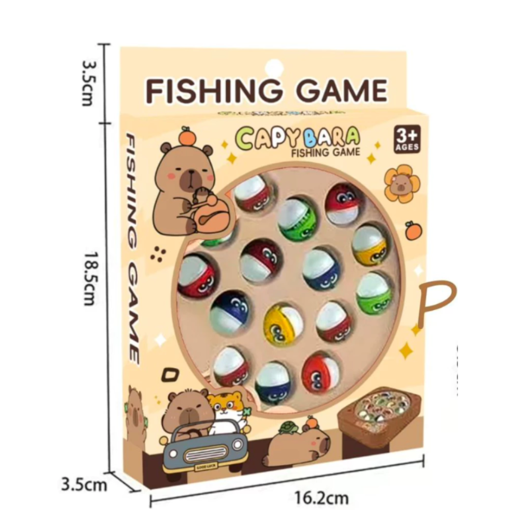 Um brinquedo interativo e educativo para crianças, com o tema de capivara e design divertido. O jogo simula a clássica pescaria, onde peixinhos giram e abrem/fecham a boca, desafiando a criança a pescá-los com uma varinha (não visível na embalagem, mas geralmente inclusa).