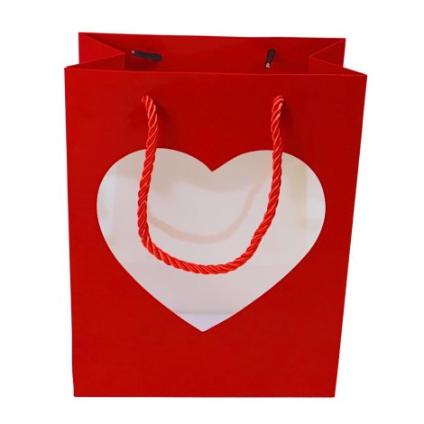 Sacola de papel 18x13m cm com estampa colorida e recorte em formato de coração transparente na parte frontal, permitindo visualizar o conteúdo interno;
